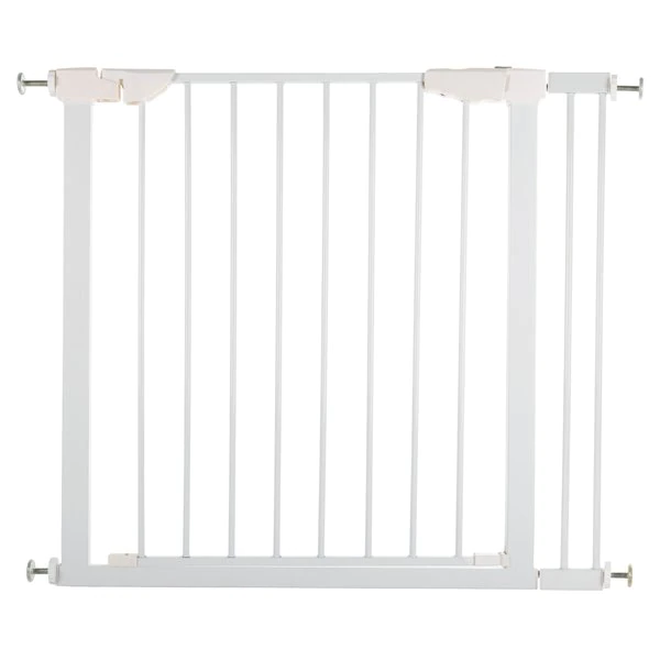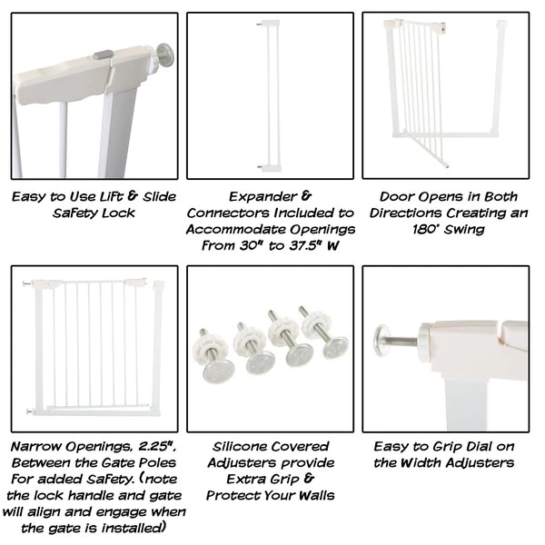 The Walk-Through Pet Gate from Pet Adobe is a safe and efficient way to confine your pets while offering a decorative touch to your home decor. The walk-through style barrier is adjustable from 29.5-33.5 inches long and also conveniently comes with an expander kit to add an additional 4 inches to accommodate most doorways, thresholds, hallways, and staircases without marking walls or drilling holes. The door conveniently swings open 180-degrees in both directions and is opened with a simple lift and slide mechanism, for easy access to the area.