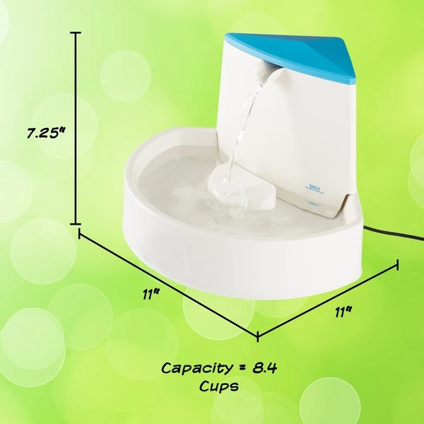 Keep your pets healthy and hydrated with the 2 Liter Water Fountain by Pet Adobe. This automatic electric water fountain includes a submersible pump to create a constant flow of water. Circulation keeps water tasting fresher for longer, encouraging pets to drink more. The water dispenser has a maximum capacity of 2 liters (8.4 cups). This makes it ideal for homes with large dogs or multiple pets to keep them hydrated and healthy. This water fountain includes four charcoal-filled water filters. These filters are designed to catch hair, debris and other unwanted particles to keep your pet's water supply clean and clear. The filters should be changed every 3 to 4 months for optimum use. The holding tank, lid and holding dish of this pet water fountain are dishwasher safe for easy and convenient cleaning. The whole unit disassembles easily for weekly cleaning and sanitizing.