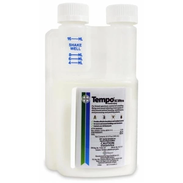 Tempo SC Ultra Insecticide is a liquid formulation containing 1 lb active ingredient per gallon which will provide effective knockdown and residual control of the pests listed in its label.Active Ingredient:Beta-cyfluthrin; Cyano (4-fluoro-3-phenoxyphenyl) methyl 3 (2-2 dichloroethenyl) 2-2 dimethylcyclopropanecarboxylate: 11.8%.Other Ingredients: 88.2%.Total: 100.0%.Caution: Harmful if swallowed inhaled or absorbed through skin. Causes moderate eye irritation. Avoid contact with eyes skin or clothing. Avoid breathing spray mist. Wash thoroughly with soap and water after handling and before eating drinking or using tobacco. Remove contaminated clothing and wash before reuse.First Aid:If swallowed: Call a poison control center or doctor immediately for treatment advice. Have person sip a glass of water if able to swallow. Do not induce vomiting unless told to do so by a poison control center or a doctor. Do not give anything by mouth to an unconscious person.If on skin or clothing: Take off contaminated clothing. Rinse skin immediately with plenty of water for 15-20 minutes. Call a poison control center or doctor for treatment advice.If in eyes: Hold eye open and rinse slowly and gently with water for 15-20 minutes. Remove contact lenses if present after the first 5 minutes then continue rinsing eye. Call a poison control center for treatment advice.If inhaled: Move person to fresh air. If person is not breathing call 911 or an ambulance then give artificial respiration preferably mouth-to-mouth if possible. Call a poison control center or doctor for further treatment advice. Have the product container with you when calling a poison control center or doctor or going for treatment.Note To Physician: No specific antidote is available. Treat the patient symptomatically.Directions for use: It is a violation of Federal law to use this product in a manner inconsistent with its labeling.Important: Read these entire Directions for Use and Conditions of Sale before using Tempo SC Ultra Insecticide.Note:Bayer Animal Health.Shake Well Before Using. Stop – Read The Label Before Use. Keep Out Of Reach Of Children.Precautionary Statements.Hazards To Humans And Domestic Animals.