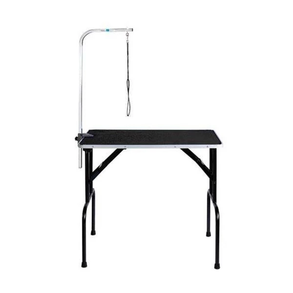 Choose our durable. top-quality Master Equipment Grooming Tables with Grooming Arms. Each folding dog grooming table features a non-slip surface. durable goalpost-style legs. and steel-reinforced rubber feet. FREE Grooming Arm & 18" LoopOur durable. top-quality Master Equipment Grooming Table features a 3/4" waterproof. laminated wood-composite top covered in black PVC with an easy-to-clean. non-slip. pebbled rubber surface. Goal-post style legs add extra stability and fold for easy transport. Legs are made of chrome-plated. heavy-duty. 1" tubular steel that is smooth welded for long life. Thick steel-reinforced rubber caps on leg ends keep table from moving. The table includes a clamp-on style 3/4" square steel grooming arm and an 18" grooming loop (30" and 36" tables come with a 36" arm; 48" table comes with a 48" arm). The tables are available in the sizes listed below. This grooming table is available in fashion colors (see item TP215) or without steel grooming arm (see item TP155. sold separately).