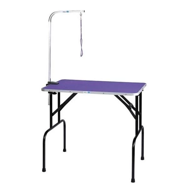 The fashionable colors of our Master Equipment Grooming Tables add a stylish touch to any shop. Sturdy tables with a non-slip pebbled tabletop. Folding grooming tables are available in blue. pink or purple. Each includes a FREE Grooming Arm & 18" Loop.Give your shop a little color with our durable. stylish Grooming Tables. The laminated wood composite top is covered in a non-slip. pebbled rubber in fashionable Blue or Pink colors and is edge-trimmed with a protective aluminum molding. Stable. goal post-style legs are made of powder-coated. tubular steel and fold for easy transport. Thick rubber leg caps keeps table from moving and won't mar floors. Each table includes a grooming arm and grooming loop.