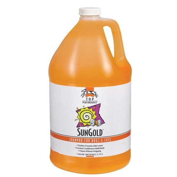 Top Performance SunGold Shampoo builds body and adds luster.Top Performance SunGold Shampoo Light. clean fragrance Builds body and adds luster Tearless formula with coconut conditioners Leaves coat soft. shiny. and lustrous. The premium formula of our Top Performance SunGold Shampoo is Ph-balanced. biodegradable. and it cleans and conditions a pet's coat without stripping its natural oils. Top Performance SunGold Shampoo is safe for puppies and kittens over 6 weeks old. Dilutes 7:1.