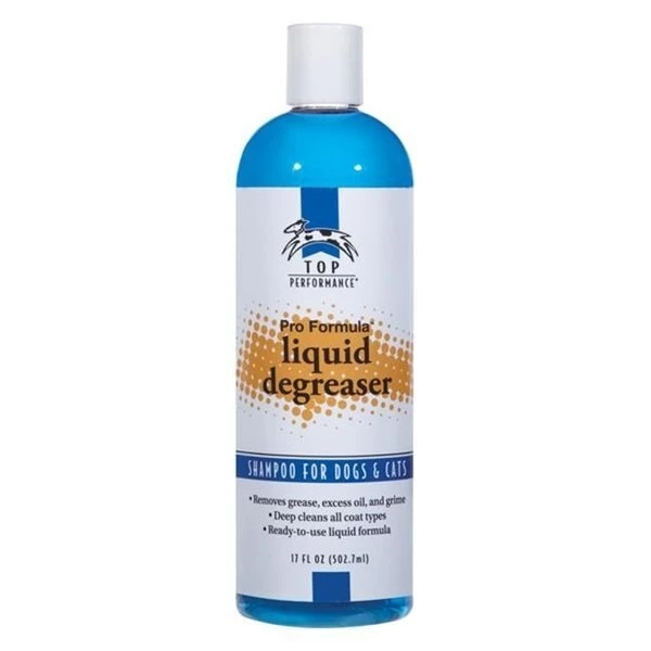 Top Performance Pro Formula Liquid Degreaser is a liquid version of our popular degreaser shampoo. Formulated to deep clean coats. leaving them grease-free and full of body and shine.The same ingredients as our Pro Formula Degreaser Shampoo. now in a ready-to-use liquid formula. Rich. lathering shampoo deep cleans coats. leaving them grease-free and full of body and shine. Great for cleaning greasy ears. controlling oily seborrhea. and removing excess oil.