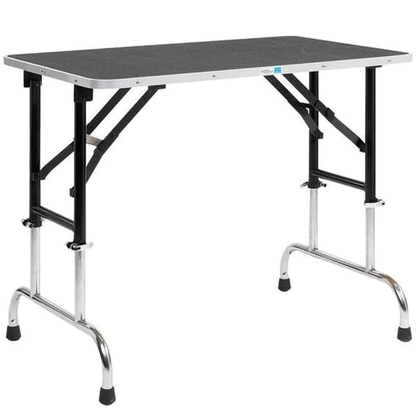 The Master Equipment Adjustable Height Grooming Table adjusts quickly and easily in 1" increments. This folding grooming table is made of high-grade plywood with a non-slip vinyl top.Our Master Equipment Adjustable Height Grooming Table adjusts easily and quickly in height from 24" to 36". Locking pins on the legs ensure even adjustment in 1" increments. Heavy-duty lever clamps with tension-adjuster screws lock legs into place. The tabletop is made of high-grade plywood covered with durable. non-slip. pebbled black vinyl. Sturdy chrome and electro-plated legs hold up to 200 lbs without wobbling. Table folds easily for storage.