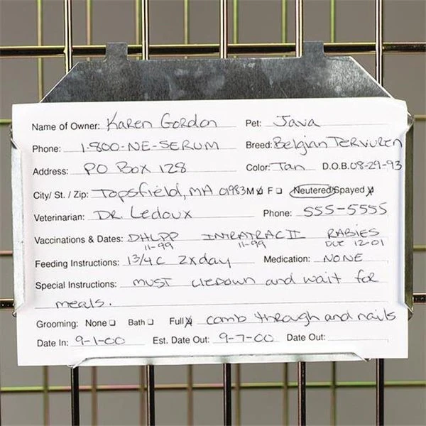 These ProSelect card holders display vital information clearly and can't be knocked off the cage by pets. For use on ProSelect crates and cages.ProSelect Card Holders feature a third hook to prevent pets from removing the holder from the crate orwire kennel doors. The heavy-stock aluminum will stay attached to any standard cage.Kennel Cards are available and sold separately (see item ZW173). Card Holders are available in the sizes listed below.