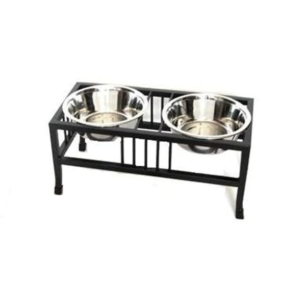 The Baron Elevated Raised Double Diner Dog Bowl is a raised dog bowl feeder with a Mission Style look. This raised dog feeder will go perfectly in a home with mission style furnishing but will also blend in well with any home design. Baron Mission Style Elevated Raised Double Diner Dog Bowl allows you to give your pet food and water at the same time in this elevated double bowl set. The raised double diner dog bowl feeder set comes with non-skid plastic tips on legs.FeaturesIncludes durable wrought iron standRectangular Mission Style designNon-skid plastic tips on legsSturdy Construction(2) Stainless steel dog bowlsRounded sides keep food and water centeredLarge bowl opening enable easy refillingRemovable bowls for easy cleaningNo sharp edgesHeight – 11 in.3 QuartsSize – Extra Large