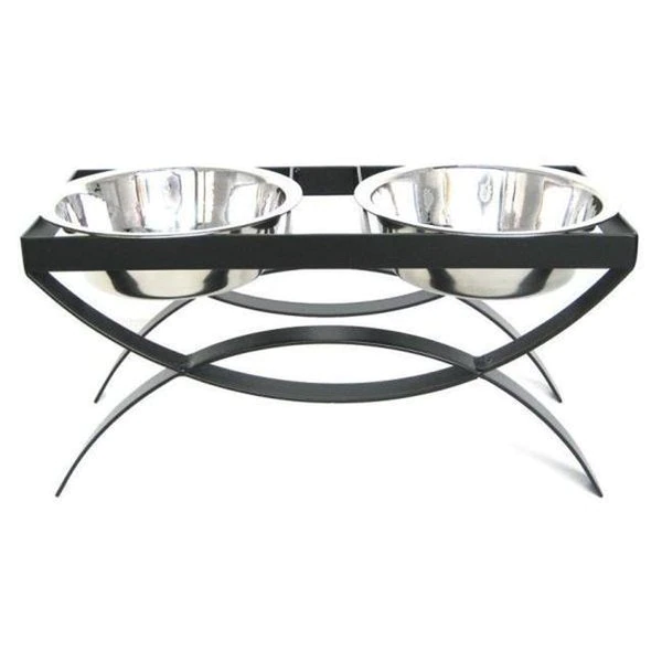 The Seesaw Elevated Raised Double Diner Dog Bowl has a style of its own that your dog will love. This raised dog bowl is an excellent choice for any pet owner. The Seesaw Elevated Raised Double Diner Dog Bowl Feeder is a sturdy beautiful design constructed from heavy duty flat iron. The elevated double diner dog bowl feeder comes with non-skid plastic feet on legs. Seesaw Elevated Raised Double Diner Dog Bowl allows you to give your pet food and water at the same time in this elevated double bowl set.FeaturesInclude heavy duty flat iron standNon-skid plastic tips on legsSturdy Construction(2) Stainless steel dog bowlsRounded sides keep food and water centeredLarge bowl opening enable easy refillingRemovable bowls for easy cleaningNo sharp edgesSize – Medium3 Quarts
