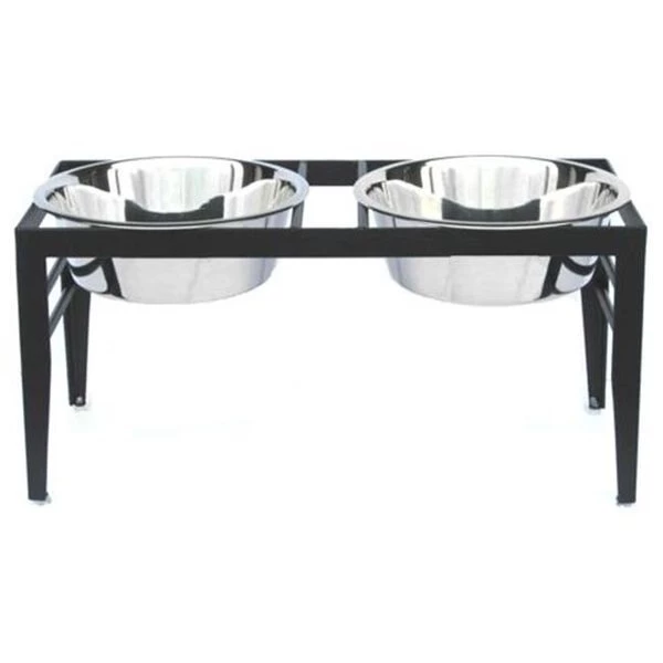 The Chariot Elevated Raised Double Diner Dog Bowl features a sleek rectangular design with angle iron legs. This raised dog bowl feeder is just perfect for any pet owner as it will work with any decor. The elevated double diner dog bowl feeder comes with crystal non-skid plastic tips and a shiny gloss finish. Chariot Elevated Raised Double Diner Dog Bowl allows you to give your pet food and water at the same time in this elevated double bowl set.FeaturesInclude heavy wrought iron standCrystal Non-skid plastic tips on legsShiny Gloss FinishSturdy Construction(2) Stainless steel dog bowlsRounded sides keep food and water centeredLarge bowl opening enable easy refillingRemovable bowls for easy cleaningNo sharp edgesSize – Large3 Quarts