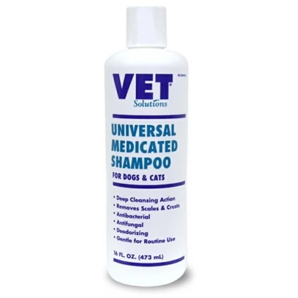 Vet Solutions Universal Medicated Shampoo is gentle enough for weekly use as a part of your dog's skin care protocol when suffering from dermatological conditions. It deodorizes as it cleans. removes crusts and scales and leave the coat manageable. Antibacterial and Antifungal.Universal Medicated Shampoo Key Benefits:Antibacterial.Antifungal.Removes. scales and crusts.Deodorizing.Gentle for routine use.Universal Medicated Shampoo may be used as adjunctive therapy for most dermatological conditions. This product has deep cleansing action. Removes scales and crusts. It is antibacterial and antifungal deodorizing and gentle for routine use.Directions: Shake well. Thoroughly wet animals coat with warm water. Massage small amounts of shampoo into the coat while continuously adding water. Continue until a generous lather is generated. Rinse well. The shampoo may be used weekly or as often as recommended by veterinarian.Ingredients: 2% Chloroxylenol. 2% Salicylic Acid. 2% Sodium Thiosulfate (source of soluble sulfur).Storage: Store this product at room temperature. Store in the original container. Keep out of the reach of children.
