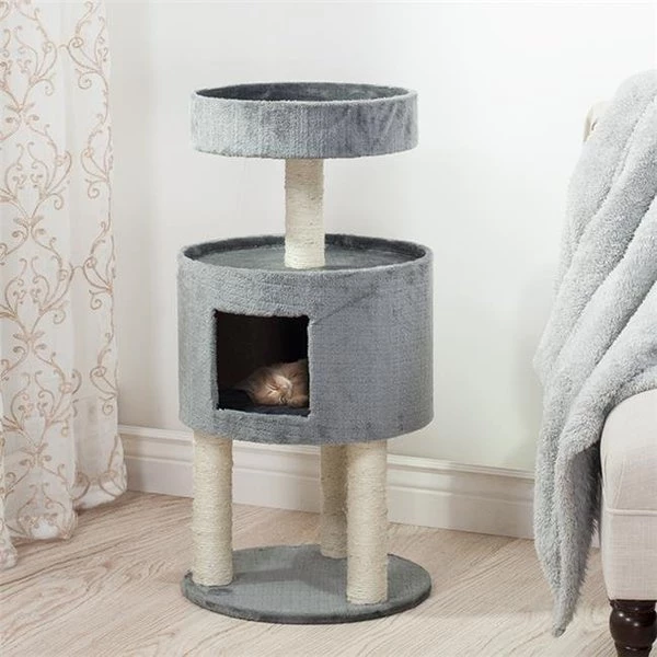 Featuring four sisal rope scratching posts and two sleeping areas. Your fur baby can lay out on the overhead balcony or get some peaceful, secluded rest in the kitty condo. The sisal rope scratching posts keep your cat's claws groomed and off of your furniture. Cats rely on vertical space for safety, comfort, and fun. FeaturesKitty condo with overhead balconySisal rope scratching posts keep your cat's claws groomed and off your furnitureCat's rely on vertical space for safety, comfort, and funTwo sleeping areas SpecificationsColor: GreyMaterials: Plush CarpetLength: 19.25 in.Width: 23.5 in.Height: 71.5 in.Weight: 19.5 lbs