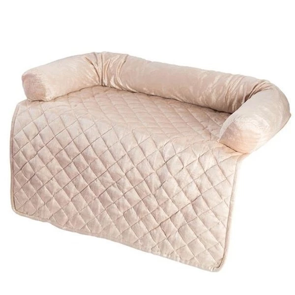 Petmaker furniture pet cover with bolster provides comfort for your pet while protecting your furniture. The water-resistant bottom layer provides extra defense against damage and stains to your upholstery. The three-sided memory foam filled bolster provides exceptional comfort for pets and protects furniture seat back and arms. Our extra-long drape helps to protect the front of your furniture too. FeaturesSpot clean with a clean damp clothRecommended for dogs under 60 poundsSpecificationsColor: BeigeMaterial: 100% Polyester. Polyurethane FoamDimension: 5" H x 35" W x 35" LWeight: 3.66 lbs