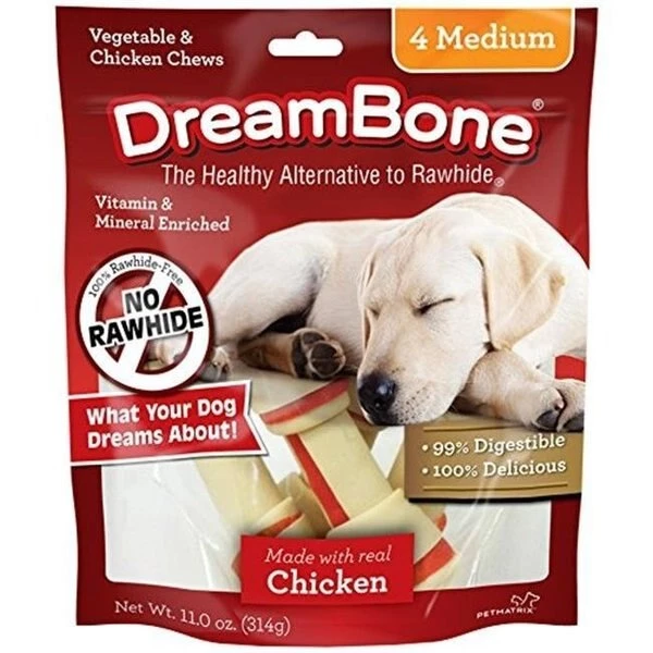 DreamBone Medium Chicken Dog Chew DreamBone have all the benefits of a rawhide chew WITHOUT the RAWHIDE! Many veterinarians are concerned with the potential health risks associated with dogs consuming rawhide. NO RAWHIDE DreamBone are made with REAL CHICKEN and wholesome VEGETABLES for a scrumptious taste dogs can't resist!. FeaturesNow made in Vietnam;; Made with Real Chicken and VegetablesRawhide-FreeEasy to DigestVitamin & Mineral EnrichedChewing Helps Maintain Healthy TeethPack of 4SpecificationsSize: MediumWeight: 0.85 lbs