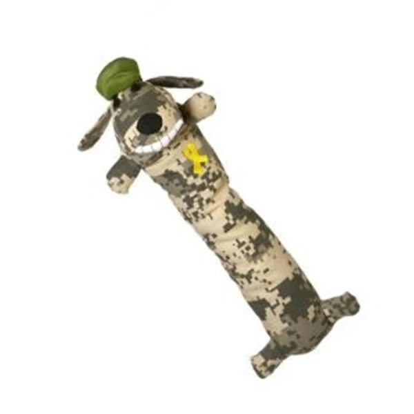 In an effort to support our troops we have created this loofa dog. Each of these dogs has a yellow ribbon embroidered on its chest as a reminder of our fighting troops. Size approx. 12in. Squeaker in body