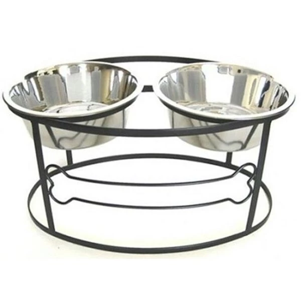 Features:Size: 20" L x 12" W x 10" HCapacity – 3 QuartsIncludes durable wrought iron standSturdy ConstructionStainless steel bowlsRounded sides keep food and water centeredLarge bowl opening enable easy refillingDetachable bowls for easy cleaningNo sharp edgesYour dog will thank you for this stylish elevated dog feeder. It will change his whole attitude toward meal time when he no longer needs to crouch down to eat. Even better. he will be able to enjoy his food and water at the same time with the side by side bowls. This feeder improves dog health and posture. The sturdy metal frame firmly holds the stainless steel bowls in place and effectively prevents messes and spills. The unique dog bone design makes this elevated dog bowl a welcomed edition to your home's decor.