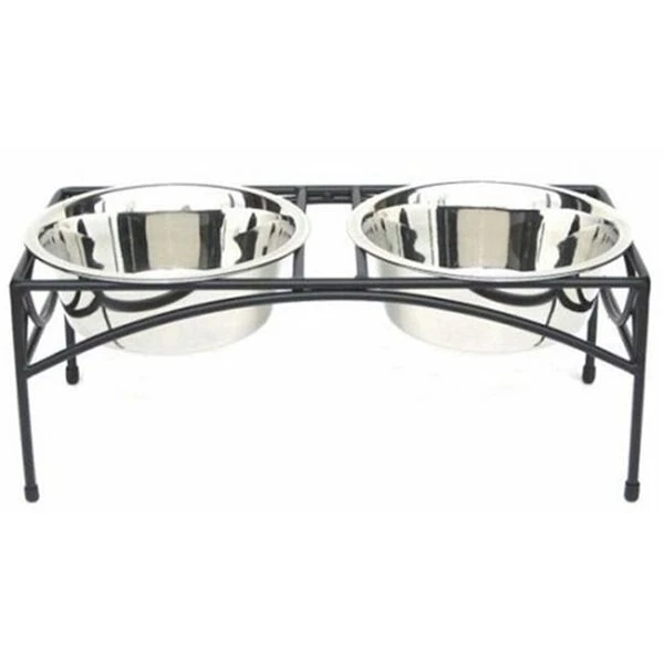 Features:Size: 21" L x 9.5" W x 12" H3 Quart CapacityIncludes durable wrought iron standSturdy ConstructionStainless steel bowlsRounded sides keep food and water centeredLarge bowl opening enable easy refillingDetachable bowls for easy cleaningNo sharp edgesThe Regal Double Elevated Dog Bowl is a stylish elevated dog bowl that is an absolute must have for your pet's happiness and health! The Regal Double Diner is a simple. elegant. back to the basics design. while still being modern and stylish. Non-skid plastic tips on legs. Elevated dog bowls are a necessity to your pet's health because they allow your pet to eat without crouching down in an uncomfortable posture. Elevated dog feeders improve back pain and neck pain. They also aid in reducing gas because your pet is able to eat in a natural position.