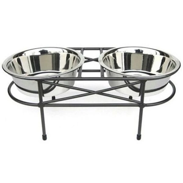 The sturdy elevated design is great for your dog's health and greatly minimizes the stress on his neck. back. and joints. This design also aids in your dog's digestion and reduces gas because your pet no longer needs to slouch to eat or drink. This raised dog bowl has an oval design to eliminate any sharp edges that your dog could catch his collar or tag on. The feet are spaced far apart and form a solid foundation so there is no need to worry about any messes from it being knocked over!FeaturesIncludes durable wrought iron standSturdy ConstructionOval designStainless steel bowlsRounded sides keep food and water centeredLarge bowl opening enable easy refillingDetachable bowls for easy cleaningNo sharp edgesSize – LargeDimension – 22 x 10 x 10 in.Capacity – 3 Quart