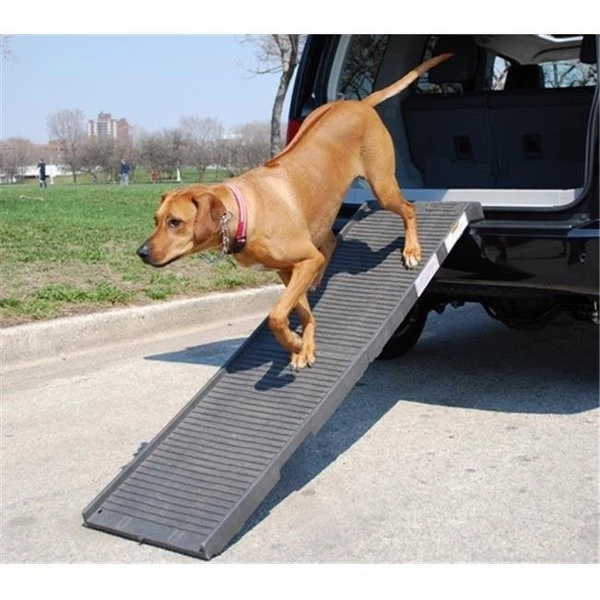 The PetSTEP Folding Pet Ramp has a soft non-slip ridged rubber surface not found on other ramps. with soft-on paws and provides superior wet or dry traction. This ramp opens and closes with ease. and the advanced plastic and fiberglass material is super light and strong. it can still hold any size dog. Weighing only 18.5lbs. it includes a built-in carry handles for ease of transport. The heavy-duty rubber grips at each end keep the ramp in place during use. Features: Non-slip ridged rubber surface. Soft on Paws.Superior traction wet or dry.Opens and closes in seconds. Safely holds any weight dog.Reduces arthritis & dysplasia pain. Lightweight (18.5 pounds).Portable (ergonomic handles on both sides).No materials used that trap odors (carpeting etc).Universal non-slip grip fits all vehicles and edges.Easily washable with soap and water. No sandpaper or carpeting to trap moisture.