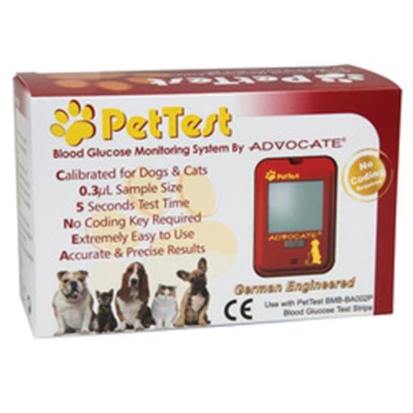 The Advocate PetTest Blood Glucose Monitoring System is used to quantitatively measure your pets glucose levels from fresh capillary whole blood samples to help manage your animals diabetes. Features include No Coding. Big Screen Display. Results in 5 Seconds. Small Sample Size. Alternate Site Testing Approved (Marginal Ear Vein. Paw Pad. Leg Callus and Inner or Outer Lip on Dogs). 400 Test Memory. Daily Alarms. 7. 14. 28 and 60 Day Result Averages. Kit contents include. PetTest Blood Glucose Meter. PetTest BMB-BA002P Blood Glucose Test Strips. PetTest Owner's Manual. PetTest Control Solution. Lancing Device. Lancets. 2 AAA batteries and Carrying Case.DirectionsInsert the test strip into the strip port. Meter will turn on automaticallySelect the correct mode for your dogs and cats by pressing the M button.Apply blood from your dog or cat. Results will be displayed on the screen in 5 secondsCautionsPetTest Blood Glucose Monitoring System is not intended for human blood glucose testing and may give inaccurate results when used on humans. PetTest Blood Glucose Monitoring System is intended for use outside the body only (in vitro diagnostic use). Only use PetTest BMB-BA002P Test Strips with PetTest Blood Glucose Meter. Other test strips may product inaccurate results. Perform all quality control checks recommended in the Owner's Manual. As with all small parts in this system. these parts should be kept away from children who still put things in their mouths. if they were swallowed. promptly see a health care professional. Read all instructions thoroughly and practice the test before using the product to test your pet's blood glucose. Do all quality control checks as directed and consult with veterinarians.