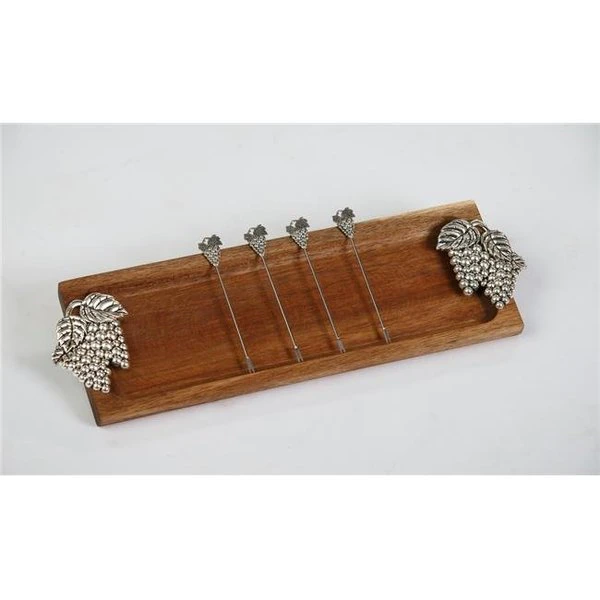 Beautiful acacia wood home entertaining serving tray by Picnic Plus with Grapes design alloy handles and a set of matching grapes handle food picks. A perfect size for foodie bites. appetizers. cheeses. desserts and more. Makes a memorable hostess. holiday. birthday or bridal gift. SpecificationsDesign: GrapesDimension: 17 1/2" W x 5 3/4" D x 1 1/2" HWeight: 1 lbs
