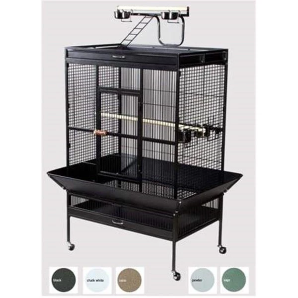 Wrought Iron Select Cage in Black offers quality craftsmanship at an affordable cost. Constructed of wrought iron with a cagetop playstand to keep your bird entertained and content, a heavy-duty push button lock keeps your bird securely inside the cage when playtime is over. This select bird cage also includes four stainless steel cups, two wood perches and a castered stand for portability. Both drawers and bottom grille are removable for ease of cleaning while the rounded corner seed guards control mess around the cage. The Prevue 3154 Select Series cage offers quality craftsmanship at an excellent value! With 4 stainless steel cups, 2 solid wood perches, a rounded corner seed guard, a pull-out tray and grill with grill clip, and a playpen top, this is a great habitat for your feathered pet. The included Select Signature cage stand has rolling casters so you can easily move the cage to clean or give your pet a change of scenery. The heavy duty push-button door lock ensures your pet's safety.36"L x 24"D x 66"H.3/4" Wire spacing.4 Stainless steel cups.2 Solid wood perches.Rounded corner seed guard.Pull-out tray.Pull-out grille with grill clip.Playpen top.