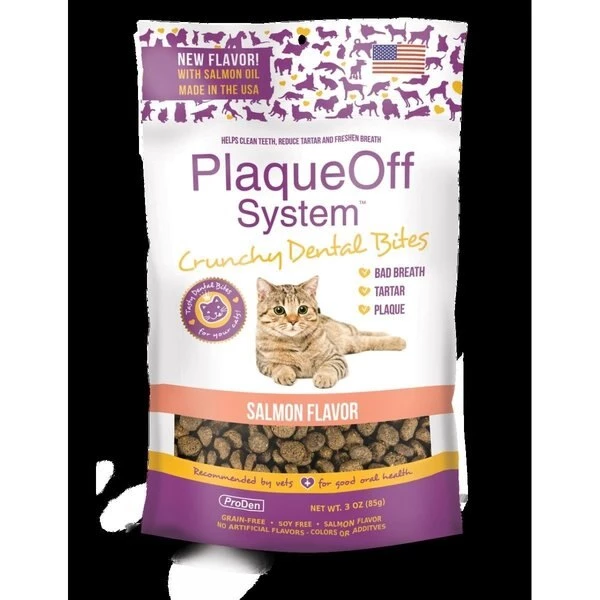 Our Crunchy Dental Bites are the only treats on the market that contain the ProDen PlaqueOff System which helps to reduce plaque accumulation. the formation of tartar and also helps improve bad breath. Crunchy Dental Bites are a perfect treat for the health-conscious pet owner. Tasty formula made specially for cats. FeaturesReduces plaque and tartarFreshens bad breathTasty formula for catsSpecificationsPet: CatFlavor: SalmonCapacity: 3 oz