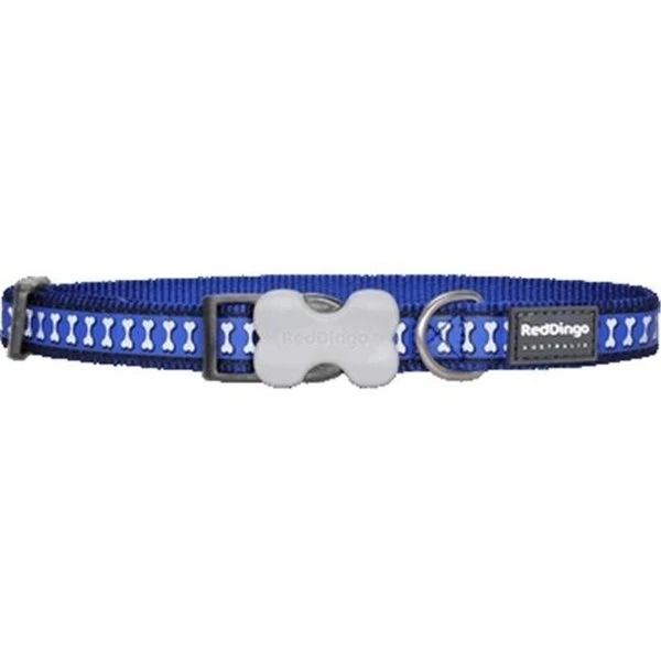 These dog collars are made with premium nylon webbing. solid stainless steel D-rings and our trademarked buckle bone side release buckle. Reflective dog collars are available in small. medium and large sizes. Features:Reflective for safety.Adjustable for perfect fit.Soft yet durable webbing.Seams-all seams are sewn (not welded) for maximum strength .An original Red Dingo trademark and registered design; the bucklebone is designed not only to look good. but to be amongst the strongest side release buckles used in the pet industry.Adjustable Length – 8-13 in.Size – Small.Pattern – Reflective Bones.Color – Dark Blue.Dimension – 13 x 0.5 x 0.5 in.Item Weight – 0.06 lbs.Chemical Type: Di(2-ethylhexyl)phthalate (DEHP)WARNING: This product can expose you to chemicals including Di(2-ethylhexyl)phthalate (DEHP) which is known in the State of California to cause cancer and birth defects or other reproductive harm. For more information go to www.P65Warnings.ca.gov.