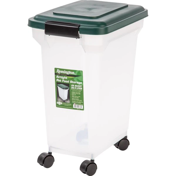 The Remington Premium Airtight Pet Food Container is the perfect container for all your pet food storage needs. This 28 quart plastic container with lid and scoop has an airtight seal that locks in freshness and keeps moisture humidity and pests out. Plastic food container holds 22 lbs.. of dry pet food. The snap lock latch signals that the lid is secured shut while the full top offers easy access to the pet food. Designed as pet food bins these BPA free airtight storage bins offer many other uses as well such as pellet storage grain storage bird seed storage cat litter storage or even as a charcoal or wood chip storage container. The IRIS Premium Airtight Pet Food Container is translucent versatile functional and can be used in any area of the house. Made in the USA. FDA-compliant and BPA-free material.