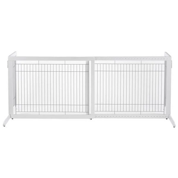 Like Richell's original freestanding pet gates. the HL has the same special features to keep your pet safely confined. Place it anywhere you need it. any time. Side panels are designed to keep the gate from tipping over. plus the rubber feet keep it from sliding. Side panels fold in for easy storage or transport. Its beautiful hardwood construction complements Richell's other fine wood pet products! Also available in HS. Small. and Large sizes. General Product InformationRecommended for small dogs 6.5 to 33 lbs. (3-15 kg.) Instruction manual included 1.25 in. space between wire slats Wire is 7 Gage or 0.144 in.Made from eco-friendly sustainable RubberwoodFeaturesSide Panel design prevents tipping over Rubber Feet protect floor surfaces and prevent sliding Side Panels fold in for easy storage or transport Beautiful hardwood construction Color – Origami WhiteDimension (L X W X H) – 39.4 – 70.9 x 23.6 x 27.6 in.Size – HL