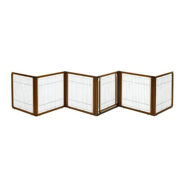 The luxury of three pet products in one: the award-winning Convertible Elite Pet Gate converts quickly and easily from a free standing pet gate – to a room divider – to a pet pen! It's specifically designed to confine your pet safely in areas with larger openings. yet fit beautifully in any home décor! The gate includes a lockable door that allows you to move freely from room to room without having to shuffle the entire unit. Each panel locks in place at 90° and 180° angles using a specially designed cap. which also provides extra stability. In addition. optional panels allow you to configure the gate. divider and pen any way you want and as large as you want! The gate's beautiful hardwood construction complements Richell's other fine wood pet products. The Option Panel and Wire Top are sold separately. The gate is available as a 4-Panel see our Convertible Elite Pet Gate 4-Panel.General Product InformationDO NOT move panels while caps are on to avoid product damage.Recommended for small-medium dogs 8.8 to 40 lbs. (4-12 kg.) Instruction manual included 1 1/8 in. space between wire slats Wire is 7 Gage or 0.144 in. Made from eco-friendly. sustainable RubberwoodFeatures1. 3-in-1 Pet GateThe luxury of three pet products in one: the award-winning Convertible Elite Pet Gate converts quickly and easily from a free standing pet gate – to a room divider – to a pet pen2. Lockable DoorThe gate includes a lockable door that allows you to move freely from room to room without having to shuffle the entire unit.3. Specially Designed CapsEach panel locks in place at 90° and 180° angles using a specially designed cap. which also provides extra stability.4. Freestanding Pet GateWhen used as a freestanding gate. the Convertible Elite 6-Panel is 130 in. wide.5. Room DividerWhen used as a room divider. the Convertible Elite 6-Panel is 135.8 in. wide. Please note because the position of the angles can vary when used in this set up that the overall widths may vary as well.6. Pet PenWhen used as a pet pen. the 6-Panel Pen is 31.5 W x 69 L x 31.5 H in.Specially designed cap locks panels in place at 90° and 180° angles for extra stability Lockable gate door allows easy movement from room to room Optional panels allow for various size configurations Beautiful hardwood construction Easy to assembleType – Gate 6Color – BrownDimension (L x W x H) – 135.8 x 29.1 x 31.5 in.
