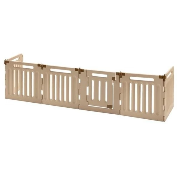 Richell’s Convertible Indoor/Outdoor Pet Playpen: it’s stylish. it’s multi-functional. it’s three pet products in one! Made of durable plastic. this playpen can be used safely indoors or outside. The playpen works great outdoors to keep your pet in its own area during family gatherings. It converts into a pet gate and room divider to confine your pet safely indoors in areas with larger openings. Because the playpen includes a lockable Gate Door. your pet has easy access in/out of the playpen. When used as a gate or room divider. the Gate Door allows you to move freely from one area to another without having to shuffle the entire unit.General Product InformationL6 – Recommended for small dogs up to 17.6 lbs.H6 – Recommended for small dogs up to 88 lbs.Instruction manual included1.25 in. space between plastic slatsDurable blow-molded plastic constructionFeatures1. Specially Designed CapsSpecially designed caps lock the panels in place at 90°. 120° and 180° angles for extra stability.2. PanelsThe 6-Panel design allows for various size configurations from a gate. to a rectangle. to an octagon.3. Lockable Gate DoorThe lock provides extra pet security and easy mobility.4. Convertible Pet Comfort MatA Convertible Pet Comfort Mat is specially designed to use with the 6-panel playpen in the hexagon configuration. Use it as a top to provide shade outdoors and/or as a floor mat for total pet comfort! Sold separately.5. Convertible Floor TrayA Convertible Floor Tray can be purchased separately and is designed to be used indoors with the 4 or 6- Panel playpens.Lockable gate door provides extra pet security and easy mobilityPanel designed to allow for various size configurationsEasy to assembleEasy to cleanType – H6Color – Soft Tan-MochaDimension (L x W x H) – 63.8 x 33.1 x 36 in.
