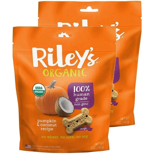 At Riley's Organics. our mission is to lead the industry into the future of sustainability through adaptation and innovation. We believe that the best possible food is attainable for our dogs and that they deserve the same quality ingredients and processes that we have. We believe that organic and all-natural are not just words. but are pathways to healthier. happier lives. Our standards demand clean. limited ingredient. human grade. 100% USDA Certified Organic products in 100% recyclable packaging the first ever in the pet market. Our products are Non-GMO Project Verified and we were the first to have a full line of certified Vegan products all made in the USA. Because dogs make a difference in our lives. we should make a difference in theirs. This is a 2 pack. Our limited ingredient. USDA Certified Organic Pumpkin & Coconut treats combine powerhouse ingredients that are rich in Vitamins as well as iron and manganese. These delicious treats are a good source of fiber and provide the essential nutrients for healthy skin and coat. Look no further. you found the super-food of vegan dog treats. Did we mention that dogs love them These treats are made in the USA with the highest quality human grade ingredients available you will love feeding themto your dog!! Riley's Treats are made with limited ingredients. are USDA Certified Organic. Non-GMO. Human Grade. Certified Vegan and Made in the USA. They are wheat. corn and soy free. FeaturesPumpkin & Coconut Large Bone Dog TreatsLarge bones are perfect for larger dogsMade in the USAPack of 2Ingredients:Organic Pumpkin. Organic Oat Flour. Organic Oats. Organic Rye Flour. Organic Peanut Flour. Organic Coconut OilSpecificationsCapacity: 5 ozSize: LargeWeight: 0.95 lbs