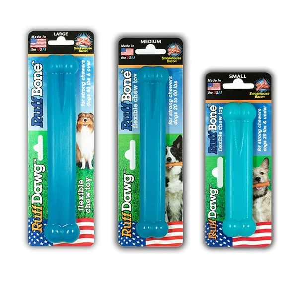 RuffBone is a tough, long lasting bone shaped chew toy for dogs. Used for long lasting play that satisfies a dog’s need to chew! MADE IN AMERICA.NOTE:Small measures 5" long and used for strong chewers 20 lbs. and under.Medium measures 6.75" and used for strong chewers between 20-60 lbs.Large measures 8.5" and used for strong chewers 60 lbs. and over.