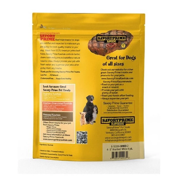 Our American Rawhide chews come in a wide assortment of shapes and sizes. Our rawhide comes from 100% American prime beef hides oven dried to perfection in our very own certified plant located in Mexico. All of our products are inspected and tested following strict GFSI food quality standards and come with a satisfaction guarantee. Savory Prime Rawhide controls tartar helps clean teeth and gums and satisfies a natural need to chew.