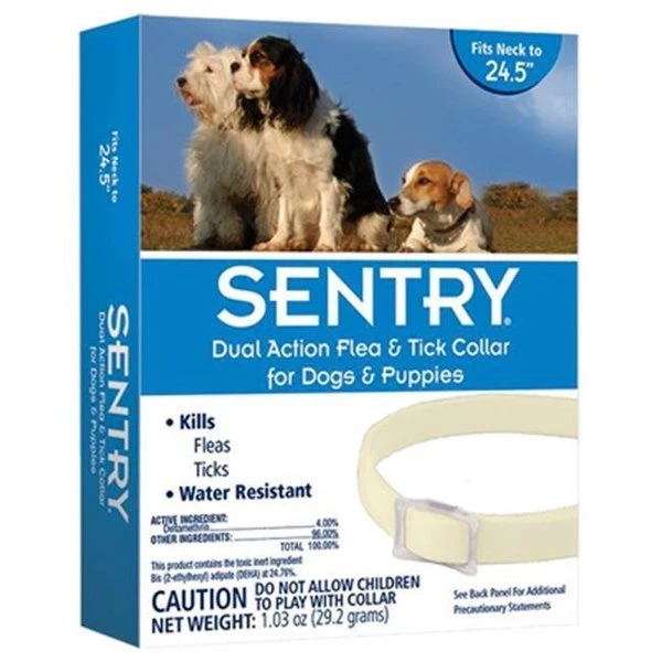 FeaturesSentry. dual action dog flea & tick collarKills fleas & ticks for up to 6 monthsFast acting. kills up to 98% of ticks within 24 hoursLong lasting protectionInjected molded collar with notchesFit the collar securely to your pet up to 24.5"SpecificationsWeight: 0.12 lbs
