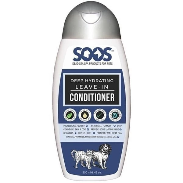 The Dead Sea has been known for centuries for its remarkable revitalizing and healing properties. Soos Deep Hydration Leave-In Conditioner and Styling Cream combines all of the exclusive benefits of Dead Sea minerals with grape seed oil. beeswax. arrowroot. pro vitamin B5 and vitamin E to condition. style and protect your pets coat. Our breakthrough blend of vitamins. minerals. oils and extracts is specially formulated to lock in moisture and provide long lasting shine. Soos Deep Hydration Leave-In Conditioner and Styling Cream will provide your pet with an unparalleled spa quality experience that will leave your pet with a luxuriously soft. lustrous and fresh smelling coat.FeaturesSoftens and brightens coatProfessional qualityProtects hair while providing long lasting shinePrevents dirt and water from penetrating sensitive areasFortified with Dead Sea Minerals. grape seed oil. beeswax. arrowroot. pro vitamin B5 and vitamin ECapacity – 250 ml.Dimension – 1 x 1 x 7 in.Item Weight – 1 lbs.DirectionsShake well before use. Massage gently into the your pets dry fur. Avoid eyes. Let dry normally. Do not rinse. Store at room temperature. Recommended use: twice a week. Use only as directed.IngredientsDead sea water. glycerine. cetearyl alcohol & ceteareth 33. polyquaternium 7. panthenol pro vitamin b5. beeswax. microcrystalline wax. ricinus communis castor oil. tocopherol vitamin e. vitis vinifera grape seed oil. cetrimonium chloride. maranta arundinacea arrowroot powder. Dead sea salt. Dead sea minerals extract.