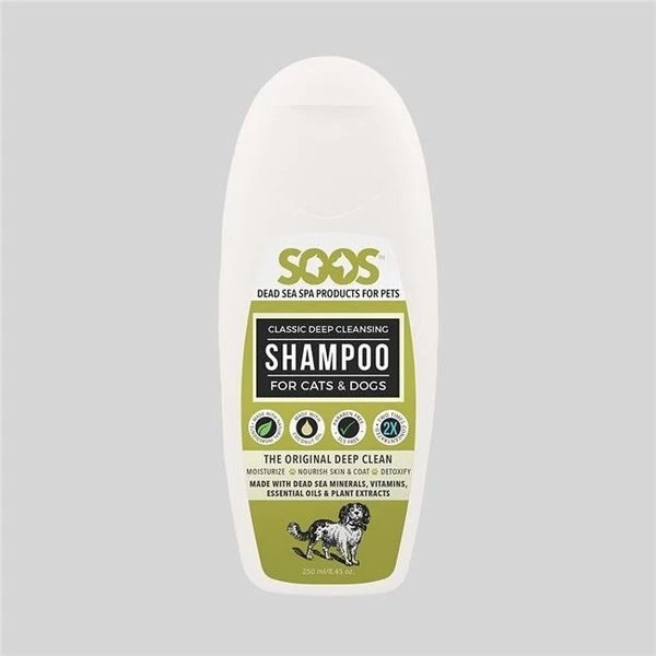 Harsh chemicals in most pet shampoos strip away natural oils leaving your cat or dog's skin and coat dry. brittle and damaged. Our classic formula provides deep cleansing and detoxifying properties that moisturize your pet's hair and skin and improve overall health. Soos Natural Deep Cleansing Shampoo combines all of the exclusive benefits of Dead Sea minerals with the natural antioxidant. antiseptic and antibacterial properties of coconut oil. lemon extract. orange oil. tea tree oil. lavender oil and honey to gently clean. calm and cleanse your pet's skin and coat.FeaturesDeep cleans. detoxifies & purifies.Cleans fur without stripping natural oils.Penetrates hair and skin to deeply hydrate.Nourishes skin and coat with vitamins. minerals and essential oils.Made with natural antioxidants. antiseptics & antibacterials.Fortified with Dead Sea salts. coconut oil. lemon extract. orange oil. tea tree oil. lavender oil and honey.Boosts immunity.Paraben and SLS (Sulphate) free.Minimum 5:1concentrated.Safe and great for use on humans and animals.Cruelty Free – NO testing on animals.pH balanced for dogs & cats.Natural ingredients.Size – 250ml/8.45 oz.