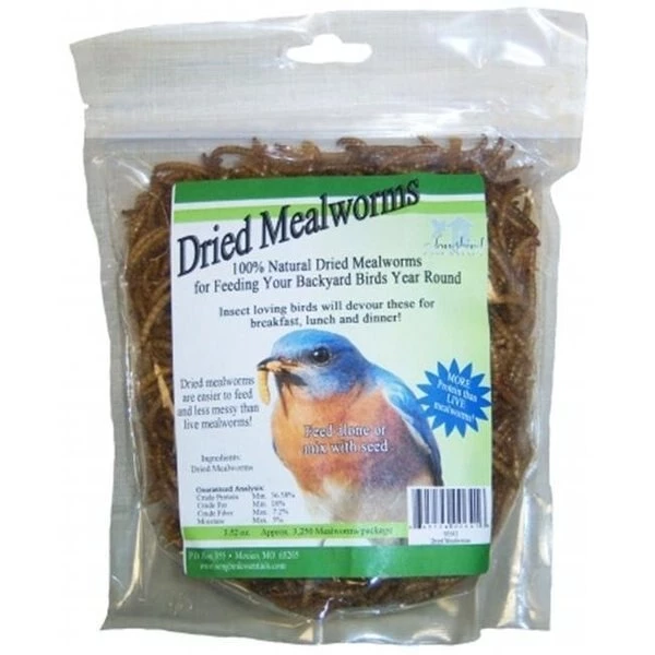 Dried mealworms are easier to feed and less messy than live mealworms. 100% natural dried mealworms for feeding your backyard birds year round. Insect loving birds will devour these for breakfast. lunch and dinner! Feed alone or mix with seed. More protein than live mealworms! Approximately 3.250 mealworms per package. Not available for sale in the state of New Mexico.Dimensions: 2.5"D x 6"W x 8"L