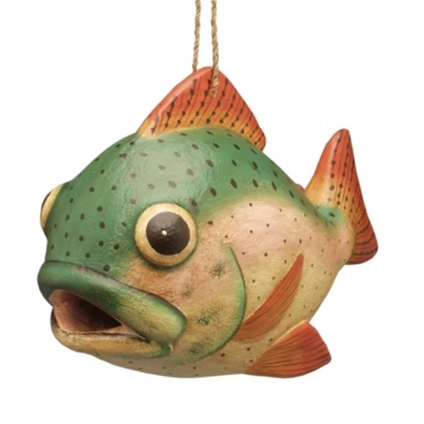 Songbird Essentials adds color & whimsy to any garden with our beautifully detailed wooden birdhouses that come ready to hang under the canopy of your trees. Hand-carved from albesia wood. a renewable resource. each birdhouse is hand painted with non-toxic paints and coated with polyurethane to protect them from the elements. By using all natural and nontoxic components Songbird Essentials has created a safe environment complete with clean-out for our feathered friends. We have included hangtags featuring our "green" source & product care.Dimensions: 11.5"D x 4.8"W x 7.2"L