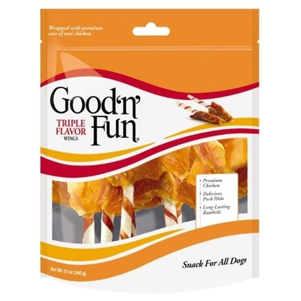 FeaturesStick treats made with the finest pork & beef hides & then wrapped with mouthwatering real chickenHigh proteinLong lasting treat with tons of flavorHealthy way to satisfy your dog's urge to chewPromotes better dental hygiene by reducing tartar build upSpecificationsCapacity: 12 ozCountry of Origin: Viet NamWeight: 1.68 lbs