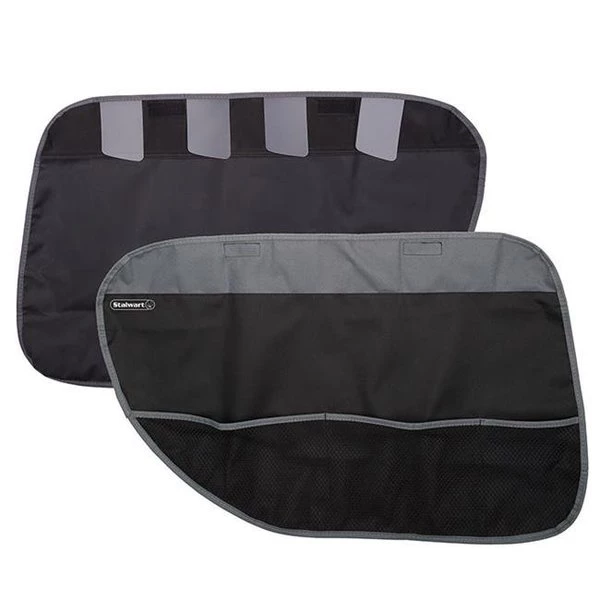 The Stalwart 2 pack door protector set helps keep your car. truck or SUV looking new. You can attache the door shield by inserting the tabs between the window and door panel and or install with the enclosed cloth hook and eye tape. The black door protectors are waterproof and safe for your pets. FeaturesPet Door Protector Shield SetProtects Your Vehicle Doors from Scratches and DirtEasy to InstallMesh Pockets for StoragePlastic Tabs to Keep Protectors in PlacePack of 2SpecificationsColor: BlackSize: 27.5" L x 17.5" WWeight: 0.75 lbs