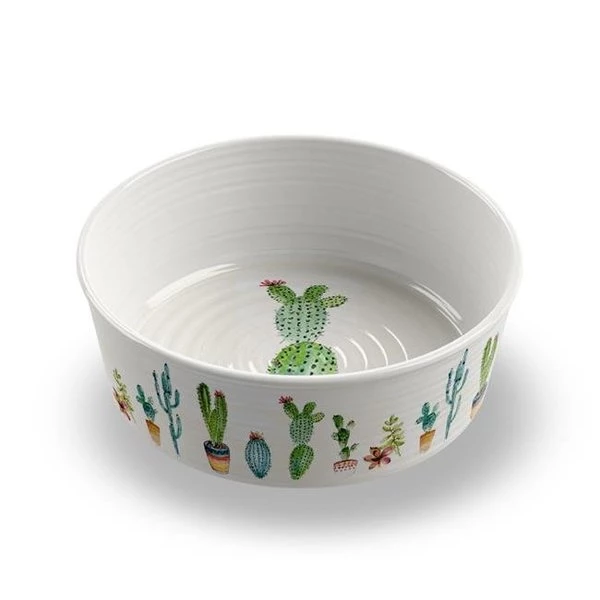 When it comes to this . our top priority is the happiness of our furry-four legged friends. Pet bowls are not only designed to be dishwasher safe and break resistant. they also include a non-skid silicone base to prevent sliding. All pet feeding products are lifestyle oriented and are intended to match your home decor. They are shatterproof. BPA . food safe and for easy care even dishwasher safe. Intended for indoor and outdoor use. FeaturesMelamine Cactus Pet BowlSet of 2SpecificationsSize: 8.5 x 2.6 in.Material: MelamineCups: 8 CupsWeight: 3 lbs