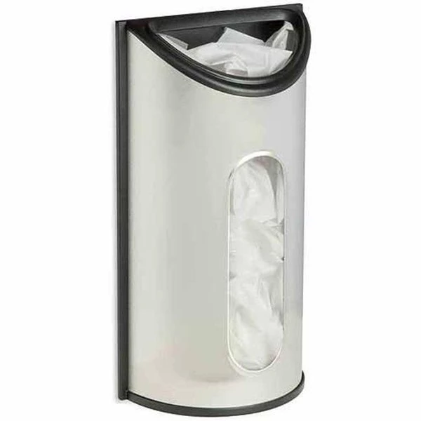 Stainless Steel Bag Saver. Mount this easy to use dispenser on a wall or inside a shelf for convenient. easy access. Stores 30 plastic grocery bags. Simply tuck them into the top opening. and pull them out from the wide dispensing area on the front of the holder. Durable stainless steel construction. 3.25 L x 6.625 W x 12.25 H in.