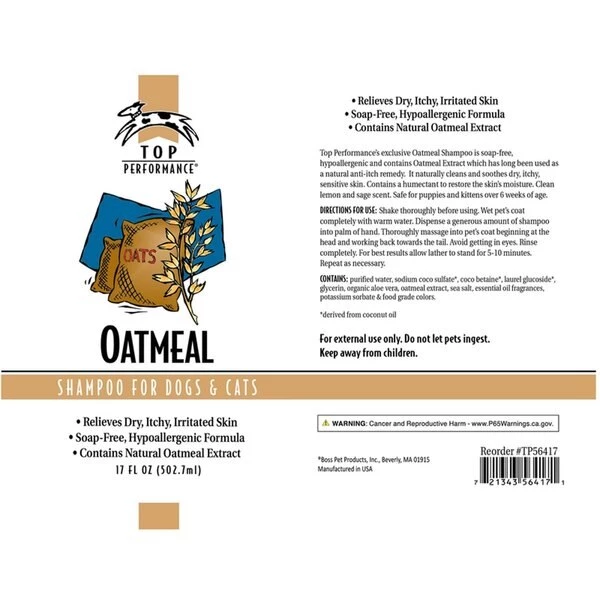 People have used oatmeal-based shampoos and soaps for decades to treat their own itchy and dry skin and the formula works on pets too. The Top Performance oatmeal shampoo is safe to use with pets. The oatmeal-based shampoo restores moisture to the skin of dogs and cats to help with alleviating itchy skin.