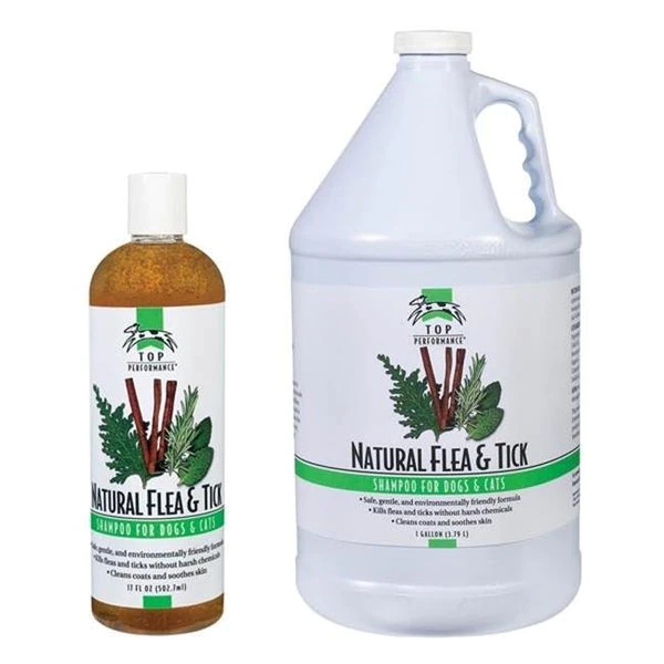 Top Performance Natural Flea & Tick Shampoo is a safe. effective. and environmentally friendly flea and tick shampoo for pets.Kills fleas and ticks on contact.Repels fleas. ticks. to prevent reinfestation.No harsh chemicals or pyrethrin-based pesticides.Fresh. clean herbal scent.Conditions and moisturizes the skin and coat with aloe. lanolin. lecithin and vitamin E antioxidants.Size – gal.Active IngredientsPeppermint Oil – 25%Cedar OilRosemary Oil – 1.00%Eugenol* – 1.00%Cinnamon Oil – 1.00%Sodium Lauryl Sulfate – 25.1%Other ingredientsVitamin E. Aloe Vera. Lecithin. Lanolin. Xanthan Gum. Tetrasodium EDTA. Deionized Water.Active ingredientsNatural plant extracts. While extremely safe for almost all animals. pets should be monitored for individual allergic reactions during and after initial treatment. If a reaction occurs. bathe pet thoroughly and consult a veterinarian.Frequency of useDaily. or as needed. Can be used on dogs and cats over 12 weeks old; also can be used as an area and furniture spray. Test in inconspicuous area for color fastness. (Product must make contact with insects to kill.)Directions for useShake well before using.Wet pet’s coat completely with warm water.Dispense a generous amount of shampoo into palm of hand and thoroughly massage into pet’s coat beginning at head and working back towards the tail.Avoid getting into eyes.Rinse completely.Repeat as necessary.