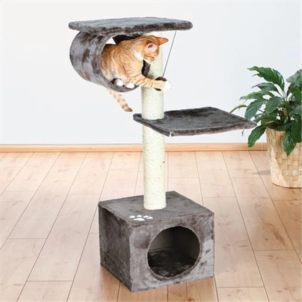 Allow your cats natural scratching instincts to flourish with trixie's san fernando cat tree. Multiple platforms and scratching posts are sure to entice any frisky feline.FeaturesWrapped in soft plush.Condo lined with fleece.Scratching posts wrapped in natural sisal.Hammock-like middle platform with metal rim for added support.Top platform with extra padding.Playing tunnel.Dangling pom-pom toy.Suitable for cats of all ages and activity levels.Assembly required. All hardware included.Color – Platinum GrayMaterial – Sisal. Mdf wood. Plush.Condo – 14 W x 14 D x 11 H in.Posts – 3.5 in. Diameter.2 platforms – 14 W x 14 D in.Tunnel – 9 in. Diameter x 10 D in.Dimension – 14 x 41.5 x 14 in.Item Weight – 19.84 lbs.