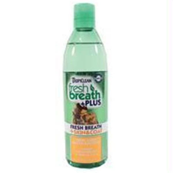 FRESH BREATH +PLUS SKIN & COAT WATER ADDITIVEOral care water additive that provides dogs and cats with essential. daily. oral hygiene.Promotes healthy gums and eliminates bad breath for up to 12 hours.Omega 3 and 6 fatty acids promote healthy skin and coat.Omega 3 and 6 fatty acids also helps with issues caused by seborrhea. skin allergies. digestive issues and more.UPC : 645095001558Size : 16 OUNCELength : 2.5Width : 2.5Height : 9Product Type : Dog – Health Care / Skin ReliefShipping Dimensions: 2.5×2.5×9