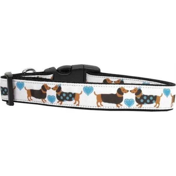 This 1" wide size medium dog collar is made of durable nylon with a high quality ribbon overlay. It is adjustable to fit a neck size from 10-18".Product Summary : New Pet Products/Doxie Love Nylon Dog Collars@Dog Collars and Leashes/Nylon Dog Collars/Doxie Love Nylon Dog Collars