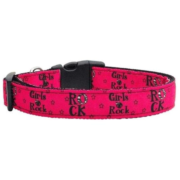 This 1" wide size medium dog collar is made of durable nylon with a high quality ribbon overlay. It is adjustable to fit a neck size from 10-18".Product Summary : Dog Collars and Leashes/Nylon Dog Collars/Girls Rock Nylon Ribbon Dog Collars@New Pet Products/Girls Rock Nylon Ribbon Dog Collars