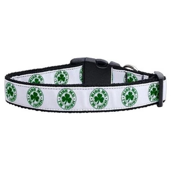 This 1" wide size medium dog collar is made of durable nylon with a high quality ribbon overlay. It is adjustable to fit a neck size from 10-18".Product Summary : Dog Collars and Leashes/Nylon Dog Collars/Kiss Me – I'm Irish Nylon Ribbon Dog Collars@New Pet Products/Kiss Me – I'm Irish Nylon Ribbon Dog Collars