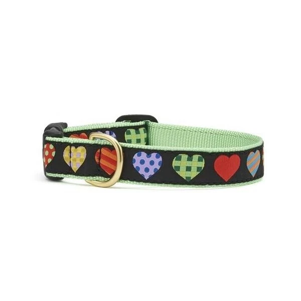 Up Country's ribbon collars. leads and harnesses come in a wide variety of lengths. and in three widths. Ribbon collars are made from high-tensile strength nylon webbing with sewn on polyester/nylon ribbons. Our ribbons are stain and fray resistant;; designed to last a lifetime. All collar and lead hardware is cast. not welded brass for extra strength. Our buckles are Coast Guard approved for high weight hold. Machine wash cold. air dry. FeaturesColorful Hearts Pet CollarQuality selection for everyday pet needsAssured hygiene and care for petsSpecificationsDesign: Colorful HeartsSize: Extra Small NarrowWide: 1"Narrow: 5/8"Teacup: 1/2"Weight: 0.5 lbs